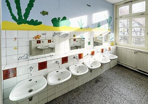 Das massive eingeschossige Gebäude (Baujahr ca. 1975) beherbergt 3 Haupträume nebst Flure und 3 Sanitärräume. Zwei Haupträume haben direkten Zugang zur überdachten Westterrasse, so dass die Kinder auch bei feuchtem Wetter Bewegung an frischer Luft genießen konnten.