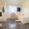 Das große Badezimmer verfügt über eine Badewanne und eine separate Dusche sowie ein Fenster, das für natürliches Licht und Belüftung sorgt, was den Raum besonders hell und freundlich macht.