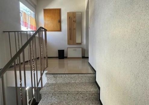 Durch das Treppenhaus abwärts erreichen Sie den Keller samt den Kellerräumen, der Sauna, dem Bad und dem Kaminofen vor der Sauna, sowie dem Treppenausgang zum Garten.