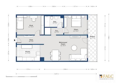 Flur, Diele, Wohn-und Esszimmer, Balkon, "offene Küche" mit EBK ( Abstand VHB € 1.500.- ) , Elternschlafzimmer, Kinderzimmer, Badezimmer mit Dusche.