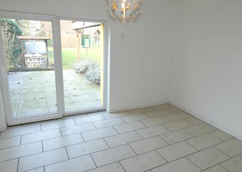 Im EG befinden sich die große Küche, ein Kinder- oder Arbeitszimmer, das Duschbad mit weißen Fliesen und weißer Sanitäreinrichtung sowie das an die Küche angrenzende Esszimmer mit Durchgang zum Wohnraum.