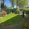Von hier fällt der Blick durch bodentiefe Fenster in den großen Garten, der mit dem Gartenhaus und der umfunktionierten Garage ausreichend Stellfläche bietet.