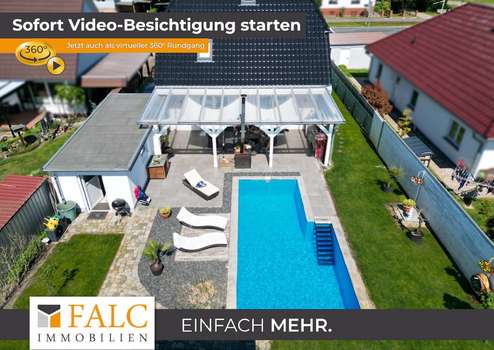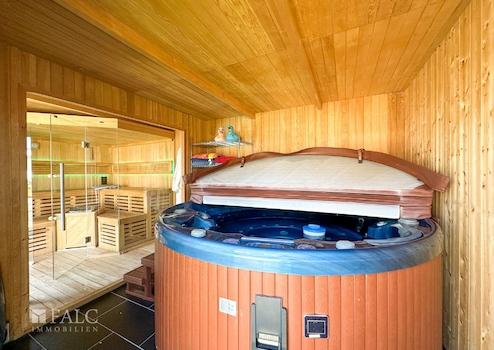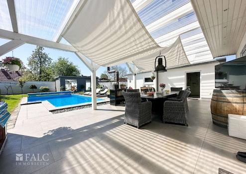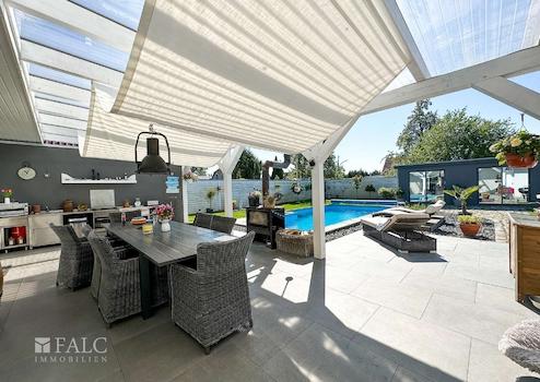 Stellen Sie sich vor, Sie kommen nach einem lebendigen Arbeitstag, einem hektischen Wocheneinkauf, einem anstrengenden Schultag nach Hause. Bequem vom Fahrzeug aus, öffnen Sie per Knopfdruck das Hoftor, fahren auf das Grundstück und parken direkt neben dem Haus und können, mit wenigen Schritten, direkt durch einen Seiteneingang oder auch durch den eleganten Haupteingang, das Haus betreten. Es empfängt Sie ein großzügig und offen gestaltetes Wohnambiente, welches u. a. durch die Terrassentüren angenehm mit Tageslicht erhellt wird und den Wohnraum im Sommer auf besondere Weise sehr großzügig ergänzt. Die Terrasse ist nicht nur überdacht, sondern auch mit einem hochwertigen BBQ-Bereich inkl. Outdoor-Küche ausgestattet, sie bietet Platz für einen schönen, großen Tisch, ein Kaminofen sorgt an kühleren Abenden für wohlige Wärme und eine gemütliche Atmosphäre, dazu der freie Blick auf den großen, beheizbaren Pool, dazu der Wellness-Bereich, ausgestattet mit einer finnischen Sauna und eine Jacuzzi, im hinteren Bereich des Grundstücks, welches selbstverständlich umlaufend mit einem Sichtschutz versehen ist. Um nur einige der zahlreichen Besonderheiten an dieser Stelle zu erwähnen.