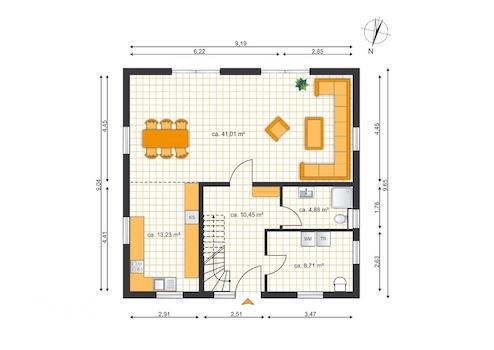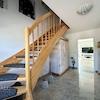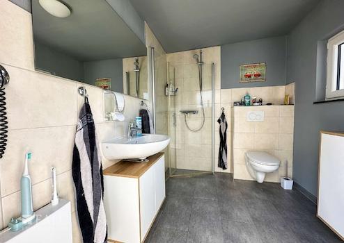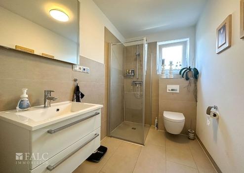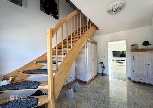 Die Wohnfläche verteilt sich auf ein Erdgeschoss und ein Obergeschoss, mit folgender Raumaufteilung, im Erdgeschoss auf einen offen gestalteten Wohnbereich mit Küche und Zugang zur überdachten Terrasse, ein Badezimmer mit Dusche und WC, einen Hauswirtschaftsraum und einen Flurbereich. Über eine Massivholztreppe aus Buche gelangt man in das Obergeschoss in dem ein Hauptschlafzimmer mit einem Bad en suite, ausgestattet mit einer frei stehenden Badewanne, einer bodengleichen Dusche, WC und Waschtisch, ein Raum, der derzeit als Gästezimmer genutzt wird, ein Raum, in dem ein Büro untergebracht ist und ein Flurbereich, von dem aus man den ausgebauten Spitzboden erreicht.