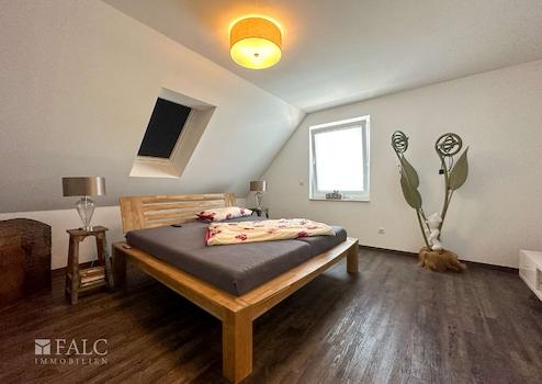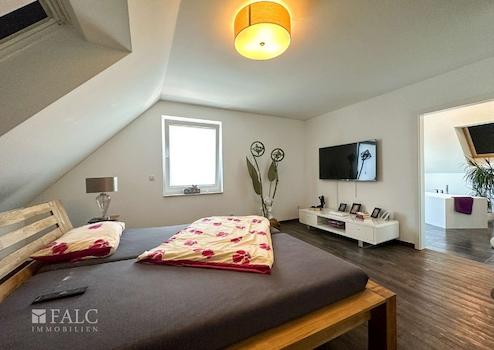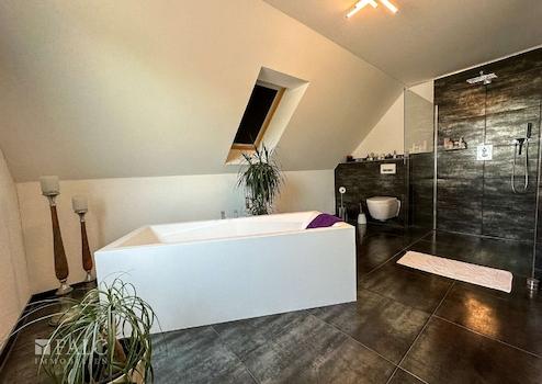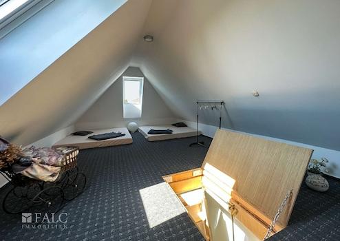 Für Rückzug und Ruhe, oder auch ungestörtes Arbeiten stehen im Obergeschoß Bereich zur Verfügung. Das Hauptschlafzimmer ist, ganz modern, mit einem eleganten Bad en suite ausgestattet. Hier lädt die frei stehende Badewanne zu einem entspannenden Schaumbad ein, die bodengleiche Dusche bietet, ebenfalls ganz in modernem Stil, Bewegungsfreiheit und das Design ist, neben ausgewählten, sehr hochwertigen Materialien, in höchstem Maße ausgesprochen elegant. Die beiden weiteren Räume der Etage sind derzeit als Gästezimmer und Arbeitszimmer eingerichtet. Und um weiteren Gästen einen Rückzugsraum anbieten zu können, ist der Spitzboden vollständig ausgebaut.