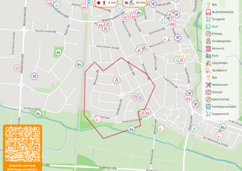 Ein Hausarzt, eine Apotheke, Einkaufsläden und diverse Restaurants zum Ausgehen sind in 2 - 5 Minuten mit dem Fahrrad erreichbar. Die Mikrolage ist insbesondere für Käufer attraktiv, die Wert auf eine ruhige, aber dennoch gut angebundene Wohngegend legen. Für Familien mit Kindern sind zahlreiche Bildungseinrichtungen in unmittelbarer Umgebung anzufinden.