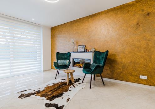 Wohnzimmer mit besonderer Wandgestaltung und Schiebetür zur Terrasse.