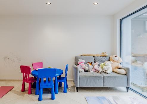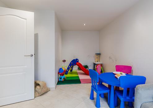 Büro/Arbeitszimmer, derzeit als Spielzimmer genutzt, mit Außentür.