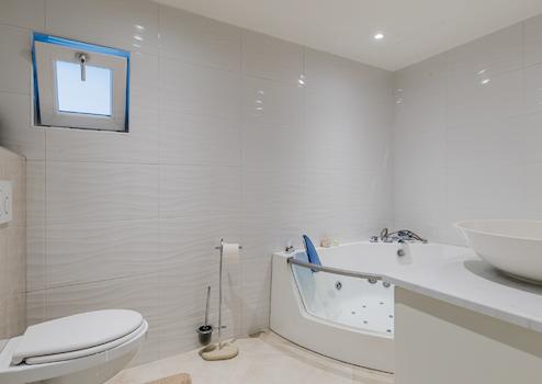Hochwertiges Badezimmer mit Whirlpool, Waschtisch, Toilette und Vorbereitung für eine begehbare Dusche.