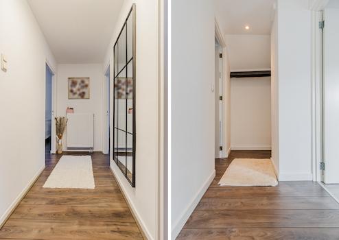 Schlafzimmer und Flur mit Laminatböden.