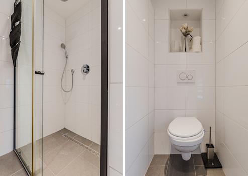 Luxuriöses zweites Badezimmer mit begehbarer Dusche, Waschtisch und Toilette.