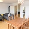 Einbauküche, komplett ausgestattet mit Geschirrspüler, Mikrowelle, Cerankochfeld, Abzugshaube, Kühl-/Gefrierschrank, Sitzplatz mit 2 Hockern.