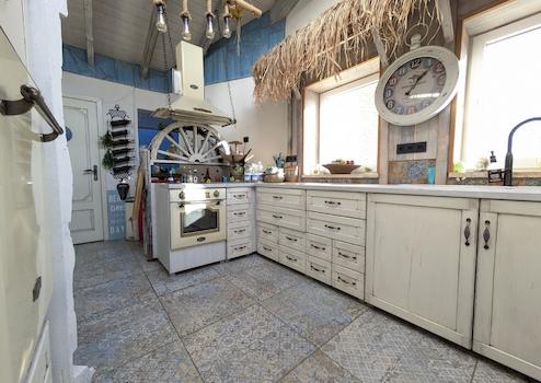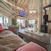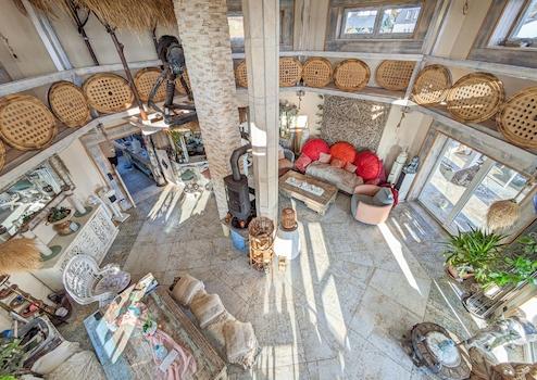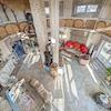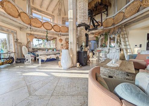 - Offenes Wohnkonzept mit hohen Decken und rustikalen Holzelementen
