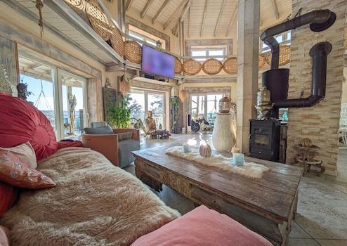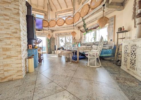 Das Haupthaus verfügt über eine offene Architektur mit hohen Decken, Sichtbalken und einer stilvollen Kombination aus Naturmaterialien und modernen Elementen. Der Wohnbereich ist geprägt von einem gemütlichen Kaminofen, großzügigen Fensterfronten und direkten Zugängen zu der weitläufigen Terrasse, die mit Glasgeländern für eine ungestörte Aussicht sorgen.