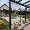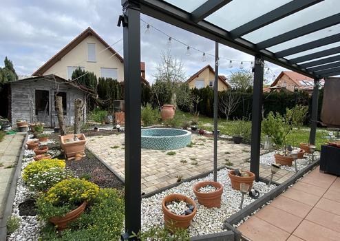Der Außenbereich beherbergt eine Kochnische mit elektrischem Herd, ein Gartenhäuschen und Platz zum Spielen.