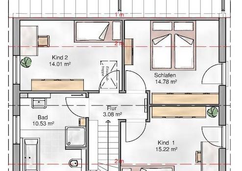 Im OG befinden sich zwei Kinderzimmer, das Elternschlafzimmer, das Bad mit WC, Badewanne und bodentiefer Dusche, sowie der Flur mit Treppe zum EG