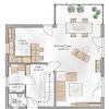 Im EG befinden sich das große Wohn/Ess-Zimmer mit der angrenzenden Küche, der Hauswirtschaftsraum, das Gäste-WC, sowie der Flur mit Eingangsbereich