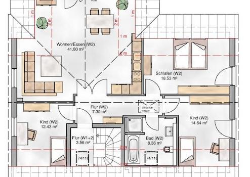 Im OG befinden sich das große Wohn/Ess-Zimmer mit der angrenzenden Küche, zwei Kinderzimmer, das Elternschlafzimmer, das Bad mit WC, Badewanne und bodentiefer Dusche, sowie der Flur mit Treppe zum EG. Das Treppenhaus und das Bad im OG erhalten ihr Tageslicht durch je ein Dachfenster.