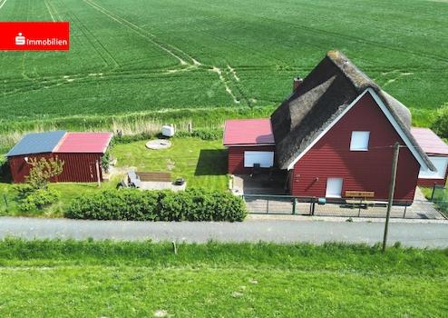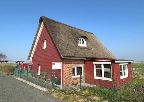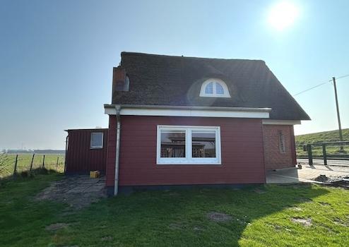 Herzlich Willkommen, Sie haben Ihr Glück gefunden. Hier begrüßt Sie eine schmucke Reetdachkate direkt am Eiderdeich. Ob als Festwohnsitz oder zur Feriennutzung. Hier finden Sie die nötige Ruhe und Erholung. Über den Flur gelangen Sie in die Einbauküche mit angrenzendem Esszimmer und in das gemütliche Wohnzimmer. Durch die Küche führt eine Tür in einen hinteren Flur mit Zugang zum Gästebad und in den Abstellraum. In dem vorhandenen Wintergarten haben Sie einen tollen Blick in den Garten. Vom Eingangsbereich führt eine freitragende Holztreppe in das ausgebaute Dachgeschoss. In diesem befinden sich ein Schlafzimmer, ein mögliches Kinderzimmer und das Tageslichtbad mit Dusche, Waschtisch und WC. Über die Jahre wurde die Immobilie laufend modernisiert und teilweise erweitert. Das Haus ist von einem gepflegten Ziergarten umgeben. Auf der Terrasse haben Sie einen tollen Blick über die angrenzenden Wiesen und Felder.