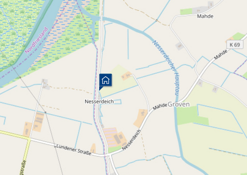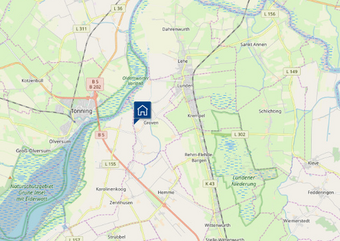 Die Immobilie befindet sich in relativer Alleinlage direkt am Eiderdeich. Hier finden Sie Ruhe und Erholung und haben einen phantastischen Blick über die angrenzenden Wiesen und Felder. Am Deich entlang führen zahlreiche Wander- und Radwege. So können Sie die Natur in vollen Zügen genießen. Die Eider und die Badestelle Wollersum sind nur einen "Katzensprung" (ca. 2 km) entfernt. Der nächstgelegene Zentralort Lunden ist mit dem Pkw in ca. 5 Minuten erreicht und verfügt über eine sehr gute, örtliche Infrastruktur. Ob Einkaufsmöglichkeiten, Dienstleistungsbetriebe, ärztliche Grundversorgung, Restaurants, Schule, Kindertagesstätte, Freibad – Lunden hat viel zu bieten! Auch die historische Stadt Tönning mit dem sehenswerten Fischereihafen ist nur ca. 8 km entfernt und mit dem Pkw schnell erreicht. Weitere Informationen zur Gemeinde Groven erhalten Sie unter: www.amt-eider.de