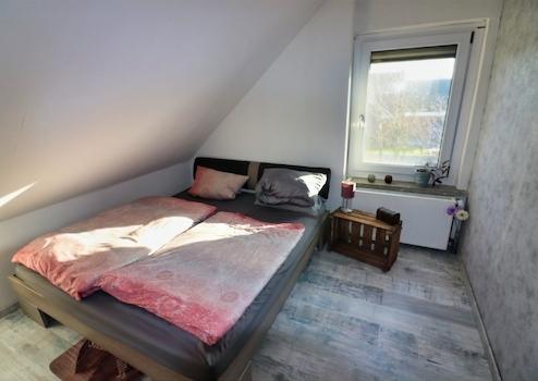 Ein großes Kinderzimmer mit Fachwerkraumteiler und ein weiteres Schlafzimmer komplettieren die Etage.