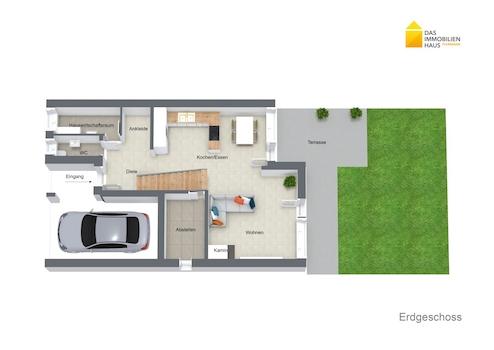 Eingang Garage, Diele, WC, Hauswirtschaftsraum, Abstellraum, Kochen/ Essen, Wohnen mit Zugang zur Terrasse und Grundstück