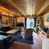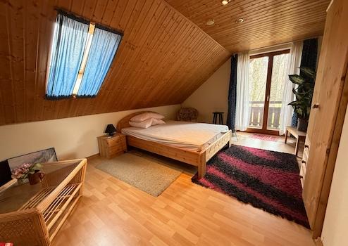 Zusätzlich zu den Schlaf- und Badezimmern verfügt das Einfamilienhaus über eine schöne Küche und ein großes Wohnzimmer mit Kaminofen und Zugang zum großzügigen Garten, hier befindet sich auch ein Pool.