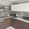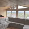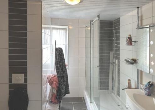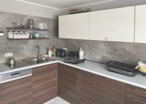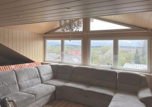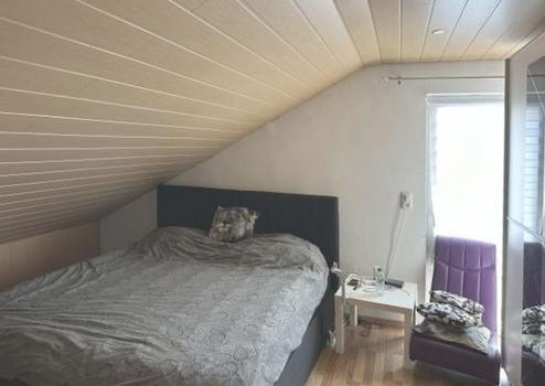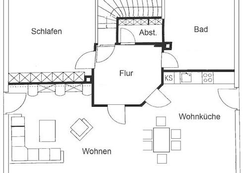 Im Obergeschoss befindet sich ebenfalls eine 2,5-Zimmerwohnung. Über den Flur sind das Schlaf- und das helle Wohnzimmer sowie der Essbereich mit offener Küche zu erreichen. Vom Esszimmer besteht Zugang zum Süd-Balkon. In der Küche befindet sich eine moderne Einbauküche. Das modern geflieste Bad ist mit einer großen Dusche, großem Waschbecken mit Unterschrank und WC ausgestattet. Weiter sind ein Abstellraum und ein Schwedenofen vorhanden.