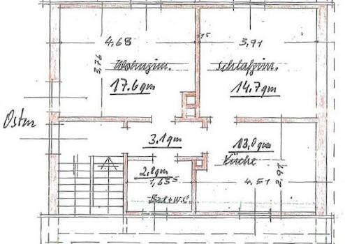 Die Dachgeschosswohnung ist mit der Obergeschosswohnung zusammengelegt. Eine Trennung ist durch geringe Umbauarbeiten möglich. Sie hat aufgrund des hohen Kniestocks gute Stellmöglichkeiten. Das Bad mit Fenster, Dusche, Waschbecken, WC und Waschmaschinenanschluss ist hell gefliest. Die Küche wird derzeit als Kinderzimmer genutzt.