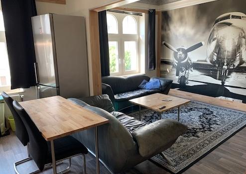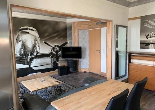 Die sich in der Wohnung verteilenden Darstellungen von alten Propellerflugzeugen, allem voran die große Fototapete, sowie die dunklen Ledersitzmöbel, erzeugen ein sehr maskulines Flair.