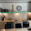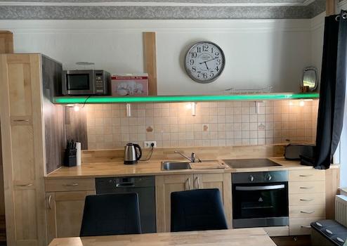 Einbauküche: Herd mit Ceranfeldern und Backofen, Spülmaschine, Kühlschrank mit Gefrierfächern; Mikrowelle,