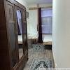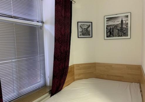 Das Bett im L-förmigen Schlafzimmer ist wie eine Nische eingebaut.