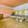 Der Saal ist mit Echtholz-Parkett ausgestattet. Die Wände sind tapeziert und farblich gestrichen.
