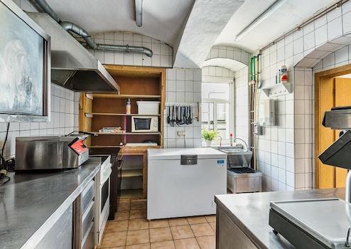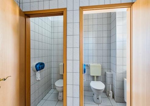 Im EG gibt es eine professionell ausgestattete Gemeinschaftsküche mit Fenster, Abluftanlage und Fettabscheider. Die Toiletten im EG verfügen über je zwei geschlechtergetrennte WCs und Waschbecken.