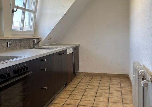 Über den gefliesten Flur mit Gegensprechanlage sind alle Wohnräume begehbar. Das Wohnzimmer ist mit Laminatboden ausgelegt und bietet Zugang zur Küche sowie zur Südwest-Loggia. Die durch die großen Gaubenfenster sehr helle und geflieste Küche ist mit einer Einbauküche versehen, welche mit Cerankochfeld, Spülmaschine sowie einer großen Kühl-Gefrier-Kombination ausgestattet ist. Auch das Schlafzimmer mit Gaube ist mit Laminatboden ausgelegt, ein Einbauschrank ist vorhanden. Im gefliesten Bad befindet sich eine Wanne mit Badewannenaufsatz zum Duschen. Zudem ist es mit Waschbecken, WC und Waschmaschinenanschluss ausgestattet.