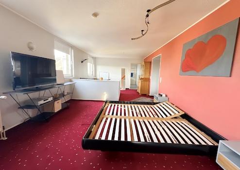 Über eine elegante Wendeltreppe erreicht man das 2. Obergeschoss. Hier erwartet Sie ein großzügiges Schlafzimmer, das dank seiner offenen Gestaltung ein luftiges Wohngefühl vermittelt. Angrenzend befindet sich das Tageslichtbad mit Wanne und Dusche sowie drei zusätzliche Räume, die sich ideal als Ankleidezimmer, weiteres Arbeitszimmer oder Gästezimmer nutzen lassen. Die großen Fenster sorgen auch auf dieser Ebene für eine angenehme Lichtdurchflutung und eine einladende Atmosphäre.