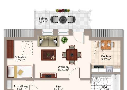 - 1-Raumwohnung mit 42,92 m² Wohnfläche