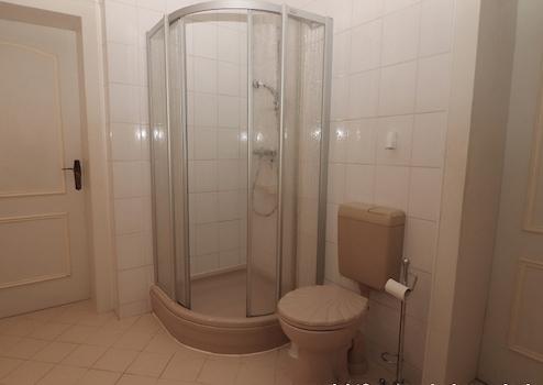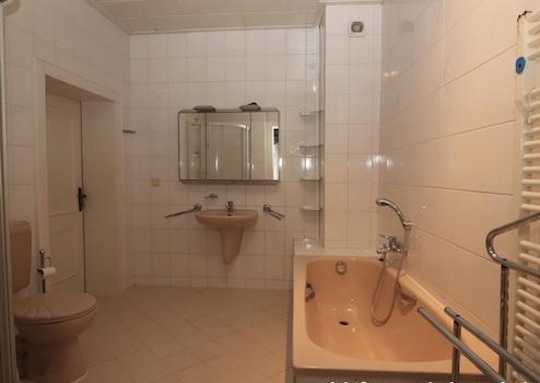 Bad gefliest mit Wanne, Dusche, Waschtisch, WC, Handtuchtrockner