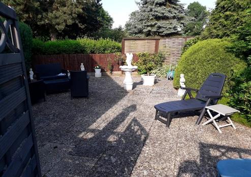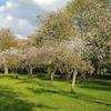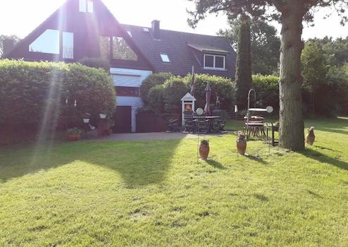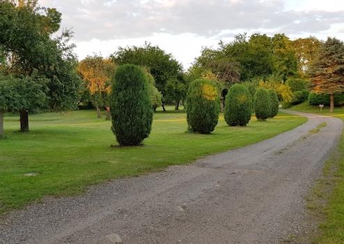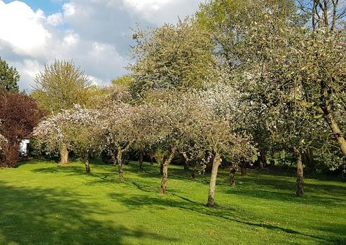Dieser vor dem Gebäudetrakt liegende Grundstücksteil bietet von dort einen herrlichen Westblick bis in die Abendstunden (Sonnenuntergang). Die Fläche nördlich der kleinen Allee besticht durch die vielen verschiedenen Obstbäume, die hier zu einer kleinen Plantage herangewachsen sind.