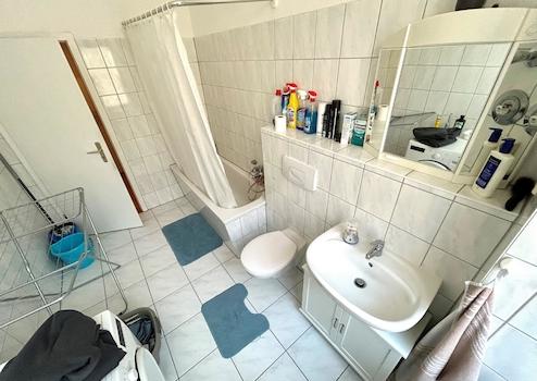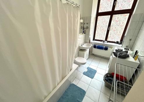 - Badezimmer mit Badewanne und Waschmaschinenanschluss