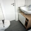 Das Wohn- und Schlafzimmer sowie der Flur sind mit hellem Laminat ausgelegt, die Küche und das Badezimmer sind mit pflegeleichten Fliesen ausgestattet. Der dunkle Fliesenboden des Badezimmers setzt einen schönen farblichen Akzent im Kontrast zum Weiß der gefliesten Wände und der Badkeramik. Das Badezimmer wurde geschmackvoll renoviert.