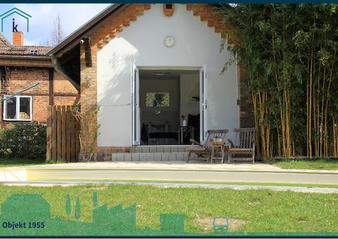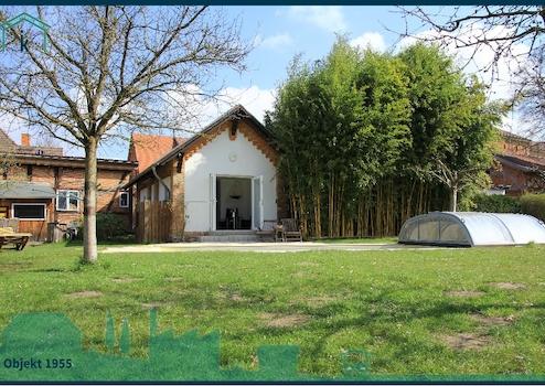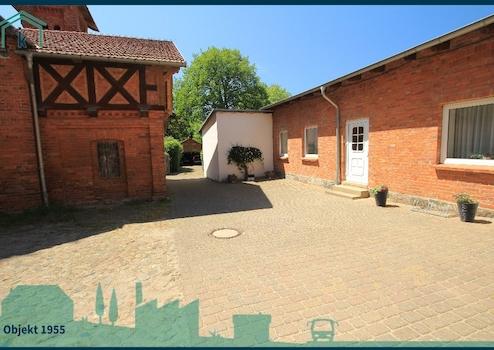 Das hier im Herzen von Dargun, mitten im "Naturpark Mecklenburgische Schweiz und Kummerower See" gelegene Backsteingebäude wurde ca. 1864 erbaut und steht unter Denkmalschutz. In den Jahren 1995 bis 1998 wurde es Kernsaniert, dabei wurden 5 Wohnungen und eine kleine Gewerbeeinheit geschaffen. 3 Wohnungen sind vermietet, eine Wohnung dient als Gästewohnung und im Erdgeschoss des Haupthauses wohnen die Eigentümer. Im laufe der Jahre haben die Eigentümer eine Oase der Ruhe geschaffen. Die Süd-West gelegene Terrasse direkt hinter der Küche, bietet viel Platz zum gemütlichen beisammen sein. Der große Garten ist für die Mieter und Nachbarschaft nicht einsehbar. Dies schaffte Freiraum für einen Poolbereich mit Pool-Haus. Der Pool hat eine Größe von 8 x 4 Meter und kann über eine Wärmepumpe beheizt bzw. gekühlt werden. Die automatische Mess- Regel- und Dosieranlage für den pH-Wert und Chlor sowie eine verschiebbare Pool-Abdeckung machen das Badeerlebnis mit Gegenstromanlage kinderleicht. Im Pool-Haus gibt es eine Dusche und ein WC. Ein kleiner Gemüsegarten mit Gewächshaus und eine Streuobstwiese mit alten Obstsorten runden diesen Ort der Ruhe ab. Die Streuobstwiese im hinteren Grundstücksbereich und der vordere Garten mit Pool, sind durch eine mit Blauregen bewachsene Pergola voneinander getrennt. Der Doppelcarport mit einer Größe von 8 x 6 Metern bietet nicht nur Platz für 2 PKW, sondern kann auch als überdachte Sitzfläche für Feierlichkeiten genutzt werden. Im Dachspitz des Carport haben Sie zusätzliche Lagermöglichkeiten.