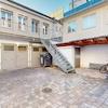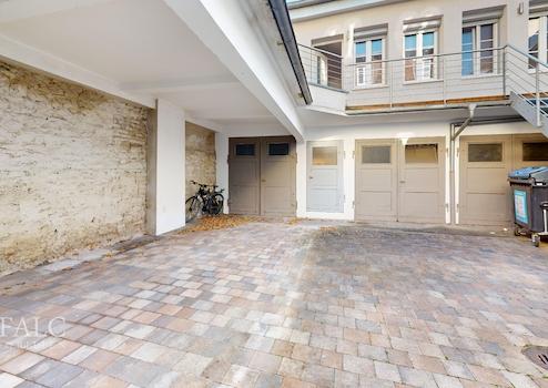 Der Hofbereich wurde im Jahr 2018 neu saniert. Hier befinden sich die Stahltreppen über welche man zu den jeweiligen Wohnungen im Mittel- und Hinterhaus gelangt, drei Garagen mit den alten Flügeltüren und der Zugang zum hinteren Kellerbereich.