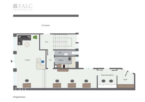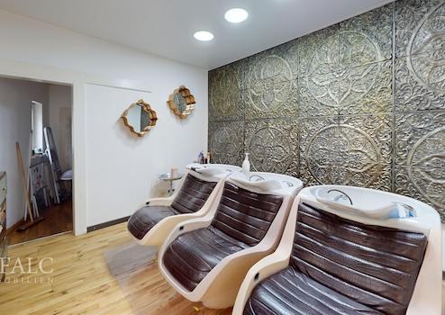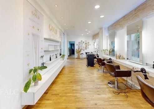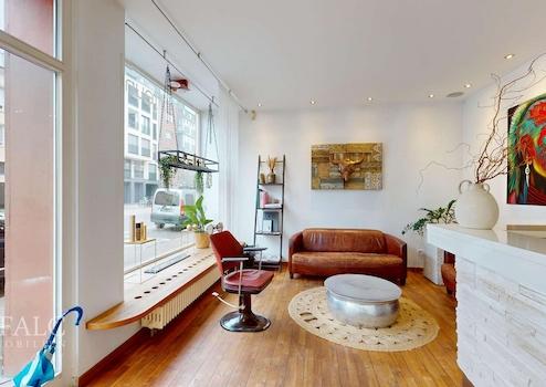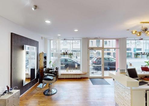 Die Räumlichkeiten beherbergen einen stilvollen Friseursalon. Kunden werden in einem einladenden, großzügigen und hellen Raum empfangen, der sofort ein Gefühl von Eleganz und Professionalität vermittelt. Eine kleine, elegante Stahltreppe führt zu den Frisierplätzen, während man vorbei an einer großen Schiebetür, die zum ersten Innenhof hinausgeht, in den nächsten Raum gelangt. Hier befinden sich die Haarwaschplätze, gefolgt von einer praktischen Farbküche, die den Salonbetrieb effizient unterstützt.