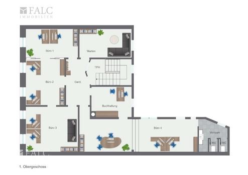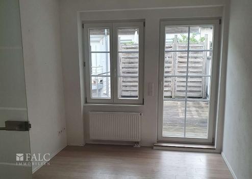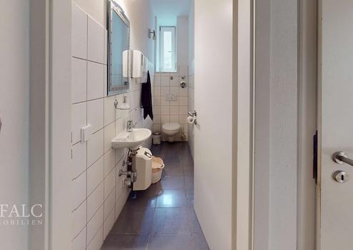Im ersten Innenhof befindet sich der Zugang zu einer attraktiven Gewerbeeinheit, die ebenerdig zum Garten gelegen ist und über eine eigene Unterkellerung verfügt. Der Hauptraum ist großzügig und länglich geschnitten, ideal für vielseitige Nutzungsmöglichkeiten. Zwei Türen führen in den hinteren Bereich: Eine führt zu einer praktischen kleinen Küche, einem Badezimmer und geräumigen Abstellräumen, während der andere Zugang zu einem separaten, kleineren Büroraum/Behandlungsraum führt.
