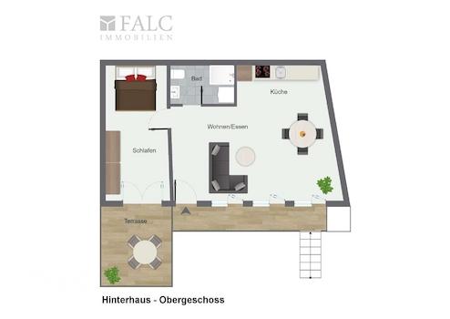 Über den zweiten Innenhof führt eine elegante Stahltreppe ins erste Obergeschoss. Beim Betreten der Wohnung gelangt man zunächst zur modernen Küche, dem Gäste-WC sowie einem praktischen Haushaltsraum auf der linken Seite. Rechts offenbart sich der Charme des Wohn- und Essbereichs, der durch sichtbare Originalbalken optisch ansprechend unterteilt wird. Von hier aus bietet sich direkter Zugang zur unteren Holzterrasse, die einen idyllischen Blick in den Hinterhof gewährt.