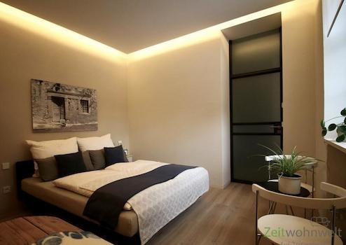 ### Please note the availability date! Bitte das Verfügbarkeitsdatum beachten! ### möbliertes Dachgeschoss-Apartment mit breiter Fensterfront; WLAN inklusive; großer Wohnraum mit breitem Bett, Kleiderschrank, Wand-TV, ...