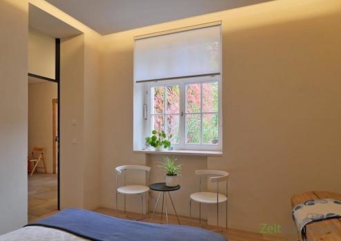 ### Please note the availability date! Bitte das Verfügbarkeitsdatum beachten! ### luxuriöses Apartment in einer ehemaligen Fabrik-Villa; logistisch günstige Wohnlage nahe der A4 zwischen Chemnitz und Zwickau; bei der geschmackvollen Einrichtung wurden viele historische Gegenstände verwendet; ruhige Wohnlage; barierefrei, Fußbodenheizung; helles Wohnzimmer im "Industrial-Style" mit moderner Couch, offene Küche, echter Kamin und Esstisch vor dem Ausgang zur Terrasse; Schlafzimmer mit Doppelbett, Kleiderschrank und Truhe, Bad mit bodentiefer Dusche und WC; Wohnungsflur mit Garderobe; Waschmaschine vorhanden, WLAN und PKW-Stellplatz inklusive; Pauschalmiete 995,00 Euro bei 1 Person, bei 2 Personen 1.125,00 Euro, Vermietung an max 2 Personen; (inkl. 7% Ust); Kaution 1.200,00 Euro; Mindestmietdauer 3 Monate; Endreinigung Mietersache; Pflichtangaben zum Energieausweis: Energieausweis gültig bis: 04.10.2033; Baujahr Gebäude: 1922; Energieausweis: nach Bedarf; Energieverbrauch: 218.3 kWh/(m²a); Energieeffizienzklasse: G; Primärer Energieträger: Erdgas, Holz