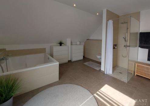 Im Obergeschoss erwarten Sie Rückzugsorte mit Charakter; ein Schlafzimmer mit begehbarem Kleiderschrank - Ihre persönliche Wohlfühloase, drei weitere Zimmer, flexibel nutzbar je nach Lebensphase, sowie ein luxuriös ausgestattetes Bad mit Walk-In-Dusche und XXL-Badewanne - ein kleines Wellnessparadies für jeden Tag. Und auch an Stauraum wurde gedacht: Der Dachboden bietet auf rund 37 qm viel Platz für alles, was nicht täglich gebraucht wird, aber dennoch Teil des Lebens ist.