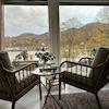 Der großzügige Wohn- und Essbereich besticht durch Panoramafenster, die einen wunderbaren Blick auf den Rhein ermöglichen. Ein Esstisch mit vier Stühlen, ein Sofa und zwei einladende Sessel direkt am Fenster schaffen eine angenehme Atmosphäre zum Entspannen und Genießen.